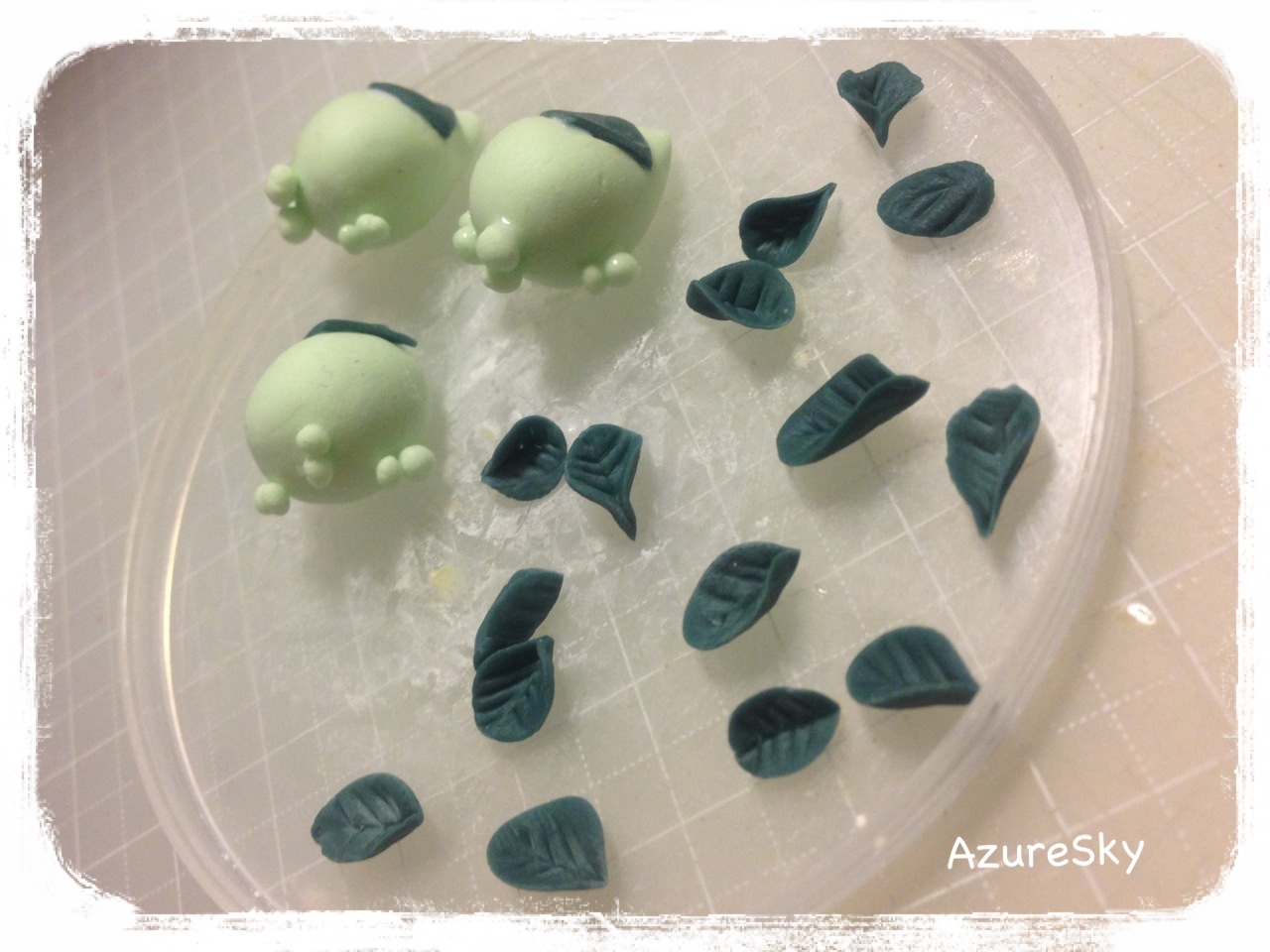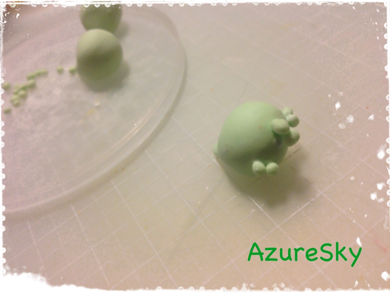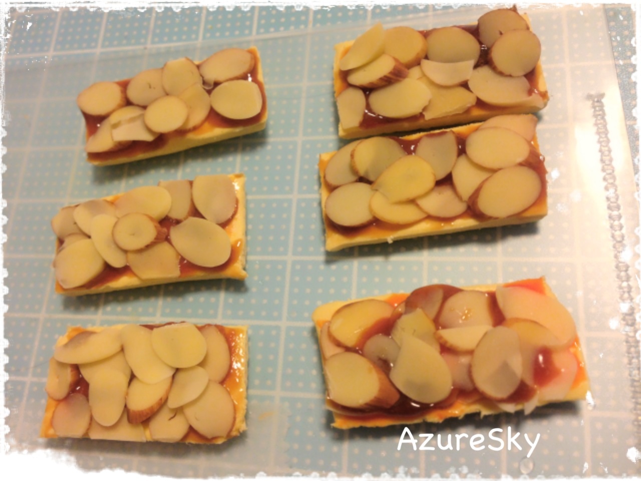 ベースを樹脂粘土(モデナソフト)で作り、着色した接着剤を塗り、予め作っておいた同粘土製のアーモンドスライスを載せました。