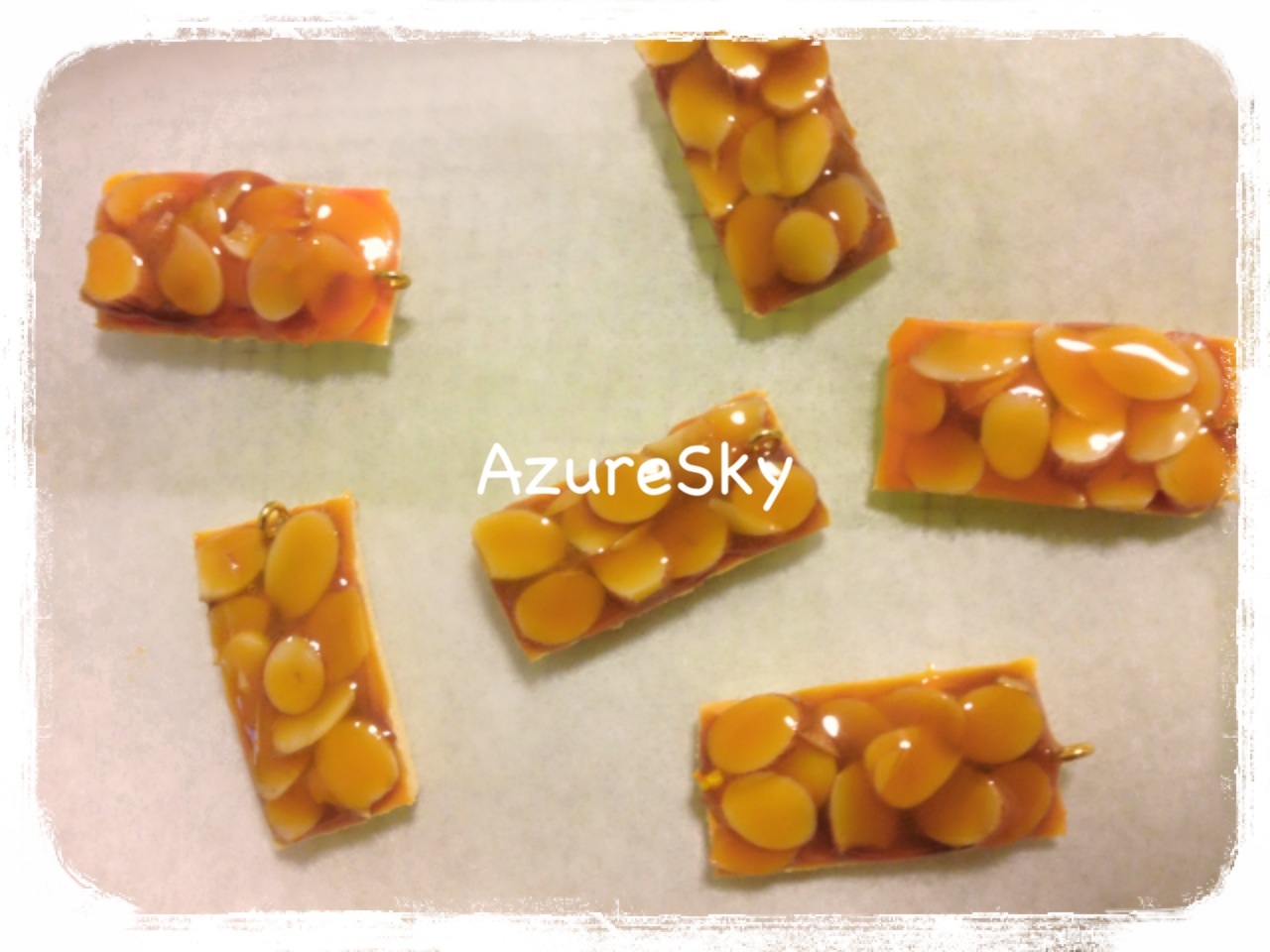 ベースを樹脂粘土(モデナソフト)で作り、着色した接着剤を塗り、予め作っておいた同粘土製のアーモンドスライスを載せました。
