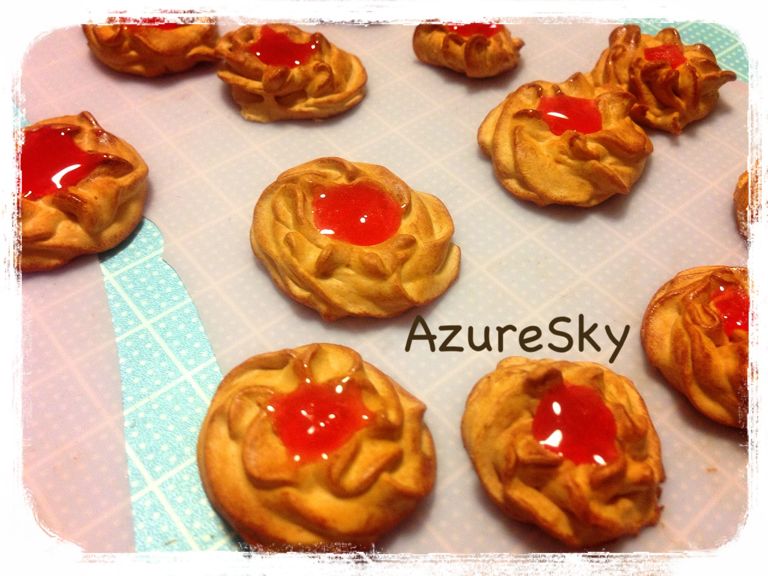 絞り出しのジャムのせクッキーが焼きあがりましたよー+。:.゚ヽ(*‘▽‘*)ノ:.。+゚