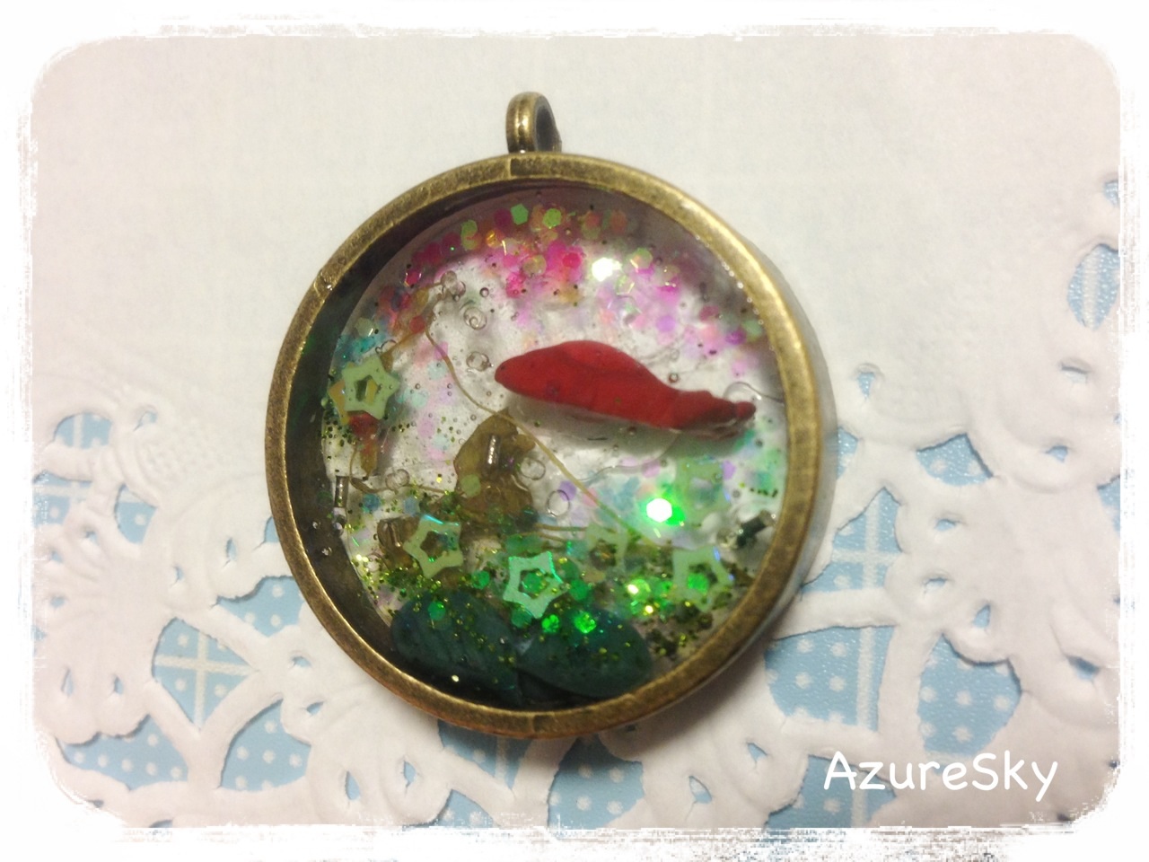 中に封入した金魚もドライフラワーの葉っぱも底にある葉っぱも全部手作りです( ' ワ '*)ノ